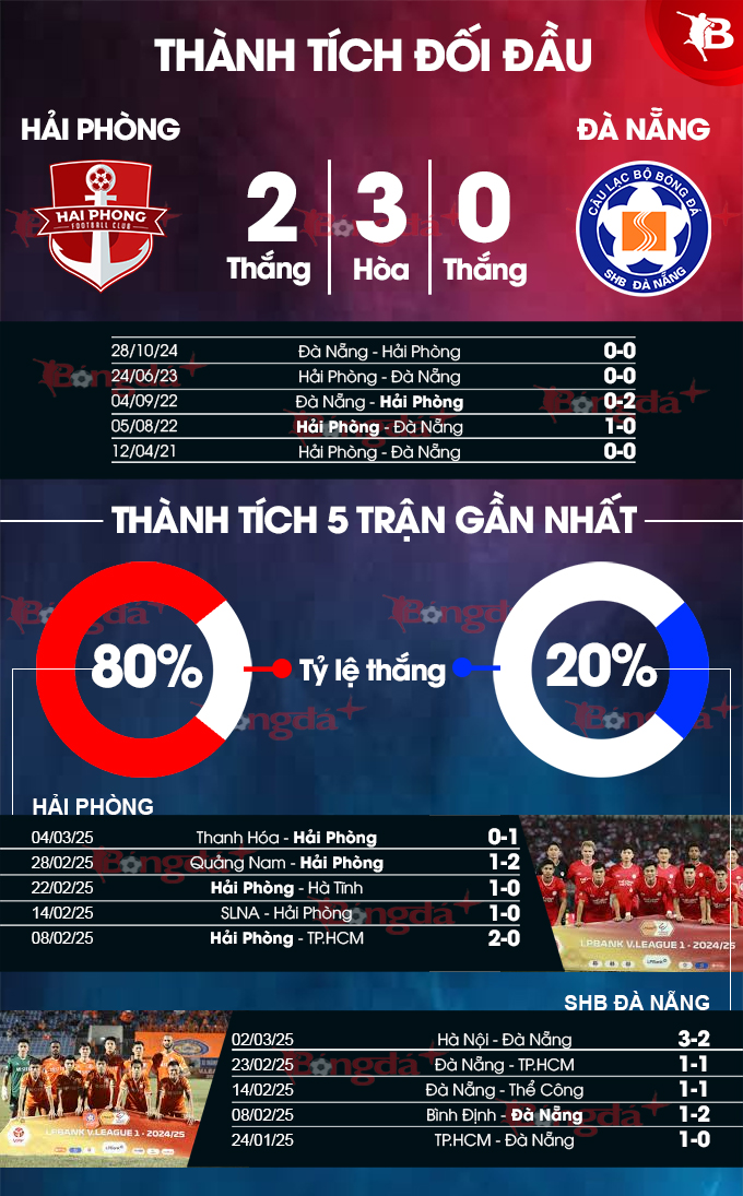 Xét đối đầu, trong 39 lần gặp nhau, Hải Phòng thắng 12, hoà 9 và thua đến 18 trận. Riêng từ năm 2021 đến nay, SHB Đà Nẵng chưa từng thắng đội bóng đất Cảng. Vì thế ở cuộc so kè này, các chân sút của SHB Đà Nẵng cần phải tận dụng tốt cơ hội của mình mới mong làm nên bất ngờ.