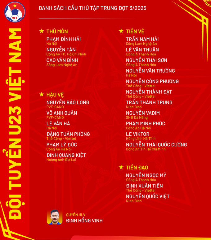 Lần này, U23 Việt Nam có sự xuất hiện của tân binh Vadim Nguyễn. Ông Đinh Hồng Vinh đánh giá cao chuyên môn của các cầu thủ Việt kiều. “HLV Kim Sang Sik cùng tôi luôn có sự tương tác, cùng với sự hỗ trợ của đội ngũ tuyển trạch. Dựa trên những tiêu chí đánh giá, U23 Việt Nam quyết định bổ sung 1 nhân tố ở lần tập trung này. Đó là Vadim Nguyễn”, ông Vinh chia sẻ.