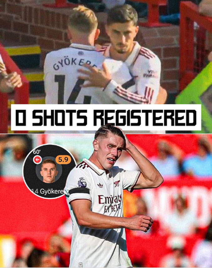 Gyokeres, bản hợp đồng trị giá trên 60 triệu bảng của Arsenal, đã có màn ra mắt khá tệ hại. Thống kê của anh ở trận gặp MU là 0 bàn, 0 kiến tạo, không tung ra cú sút nào trong 60 phút trên sân. Nhiều CĐV đã nhanh chóng ví anh như một trong những bản hợp đồng gây thất vọng nhất trong trận ra mắt Premier League.