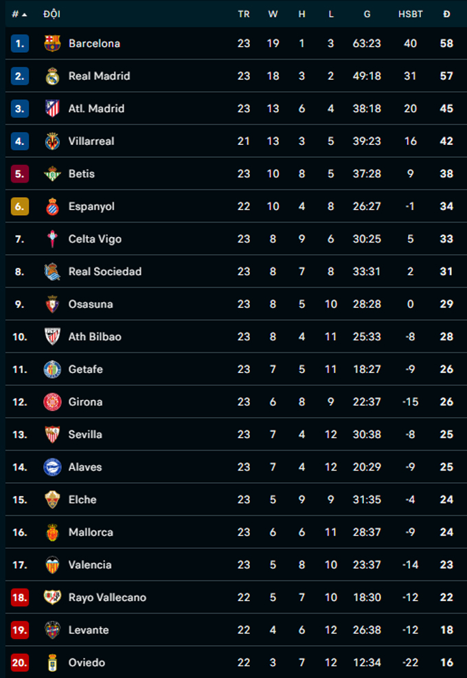 | La Liga - Vòng 23 | |||