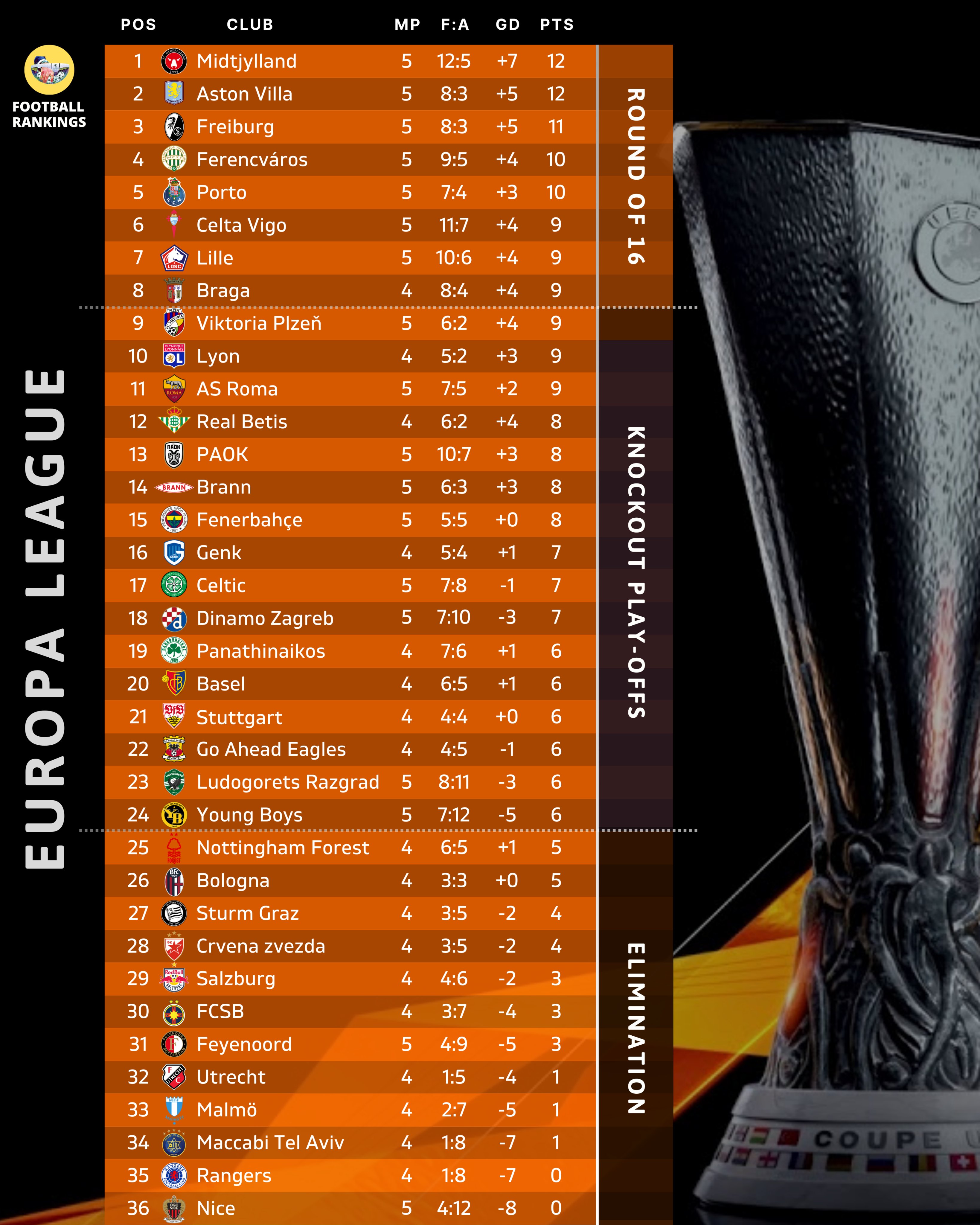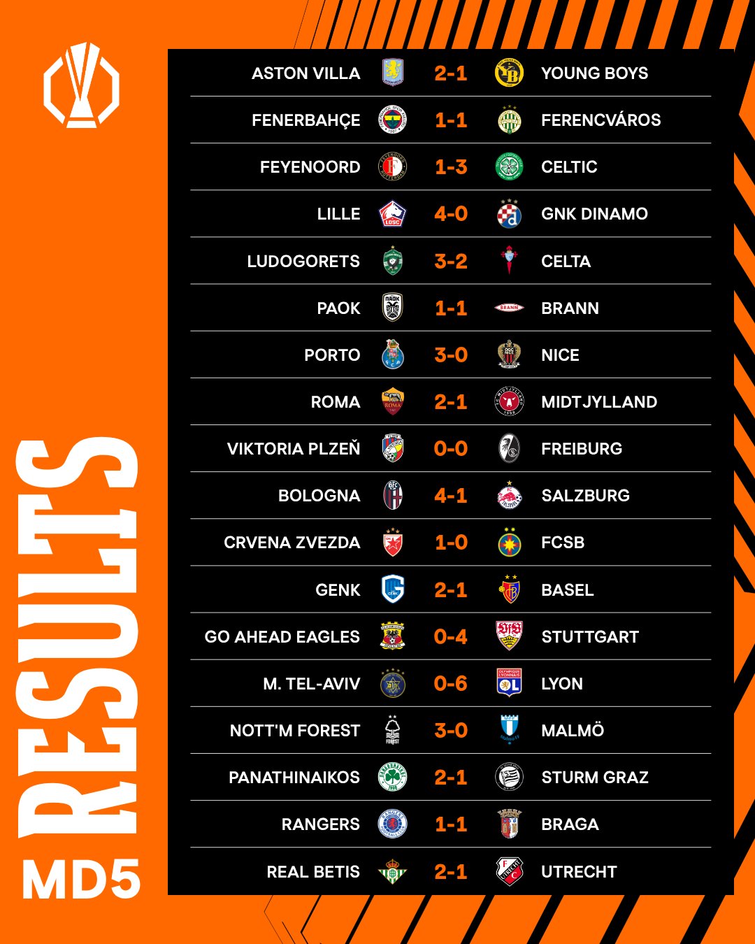 Ở các trận đấu khác của đấu trường Europa League: Porto thắng Nice 3-0, Roma hạ Midtjylland 2-1, Stuttgart thắng Go Ahead Eagles 4-0 còn Lyon đánh bại Maccabi Tel Aviv 6-0.
