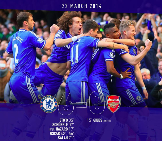 Những bàn thua tiếp tục ập đến như không thể tránh khỏi. Oscar lập cú đúp, Mohamed Salah ghi thêm một bàn trong hiệp hai. Chelsea kết thúc trận đấu với chiến thắng 6-0, tỷ số lớn nhất họ từng ghi vào lưới Arsenal trong kỷ nguyên Premier League.