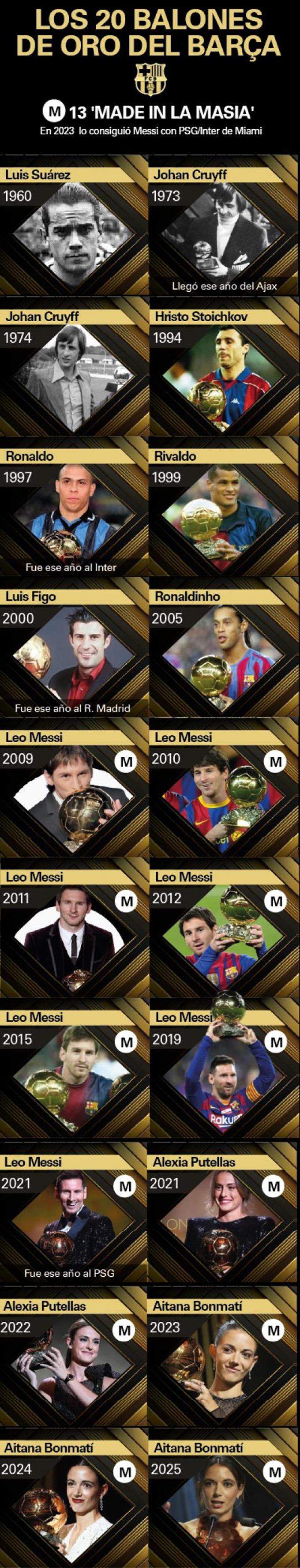 Nếu loại trừ Quả bóng vàng 2023 của Leo Messi - khi anh dành phần lớn mùa giải chơi cho PSG và sau đó là Inter Miami - con số chính thức của Barca dừng ở 20, với những cái tên như Luis Suarez (1960), Johan Cruyff (1973, 1974), Hristo Stoichkov (1994), Ronaldo (1997), Rivaldo (1999), Luis Figo (2000) và Ronaldinho cũng đóng góp vào bảng vàng này.