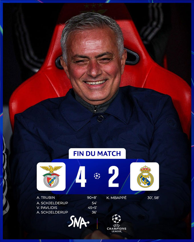 Mbappe mở tỷ số cho Real ngay phút 30 nhưng Schjelderup gỡ hòa cho Benfica chỉ sau đó 6 phút. Tới phút 45+5, Pavlidis đã ghi bàn từ chấm phạt đền giúp đội bóng Bồ Đào Nha vượt lên dẫn 2-1.