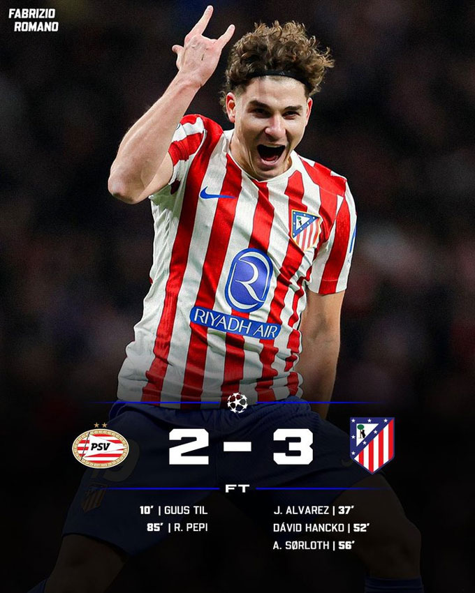 Kịch tính tăng cao khi Pepi ghi bàn rút ngắn cách biệt xuống còn 2-3 cho PSV ở phút 85. Tuy nhiên, Atletico vẫn bảo toàn được chiến thắng và leo lên vị trí thứ 7 trên BXH.