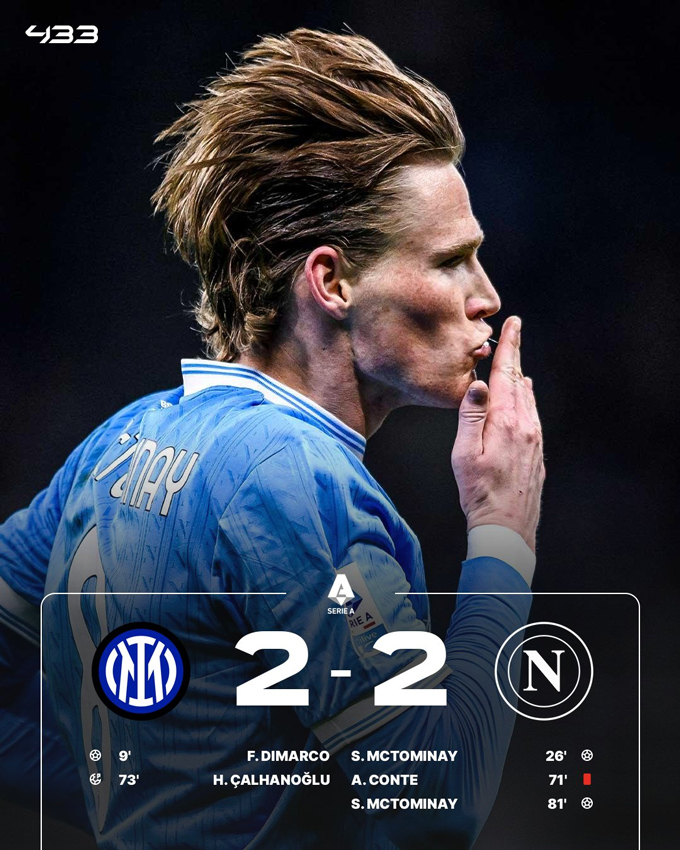 Ở trận đấu diễn ra sau đó, Inter cũng bị cầm chân trên sân nhà với tỷ số 2-2 khi tiếp đón Napoli. Đội chủ nhà mở tỷ số ngay phút thứ 9 nhờ công của Dimarco. Tới phút 26, McTominay đã ghi bàn gỡ hòa cho đội khách.