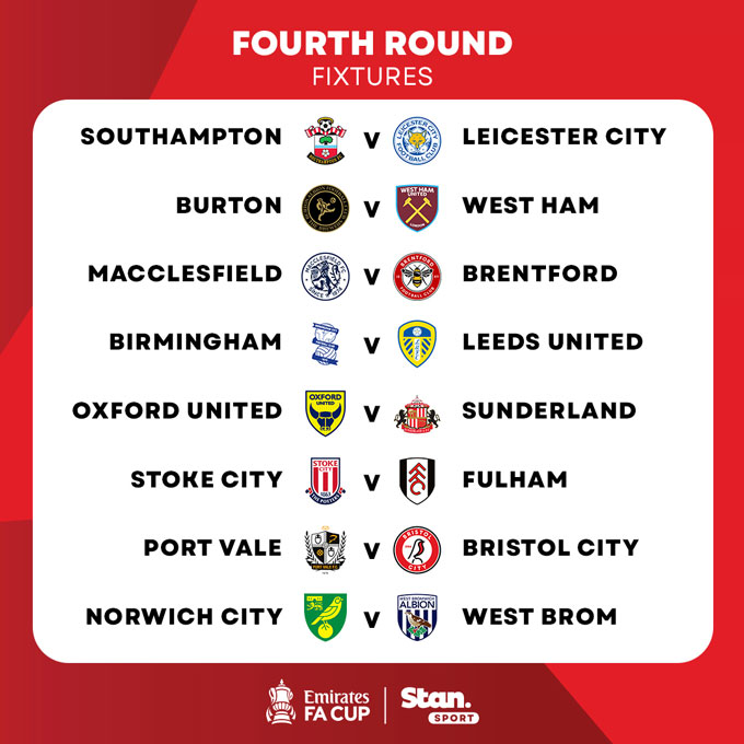 Giờ đây, 32 đội bóng giành quyền vào vòng 4 của giải đấu cúp lâu đời nhất thế giới đã biết đối thủ của mình trong loạt trận diễn ra vào cuối tuần bắt đầu từ thứ Bảy, ngày 14/2. Có không ít cặp đấu rất đáng chờ đợi ở vòng đấu diễn ra vào tháng tới.