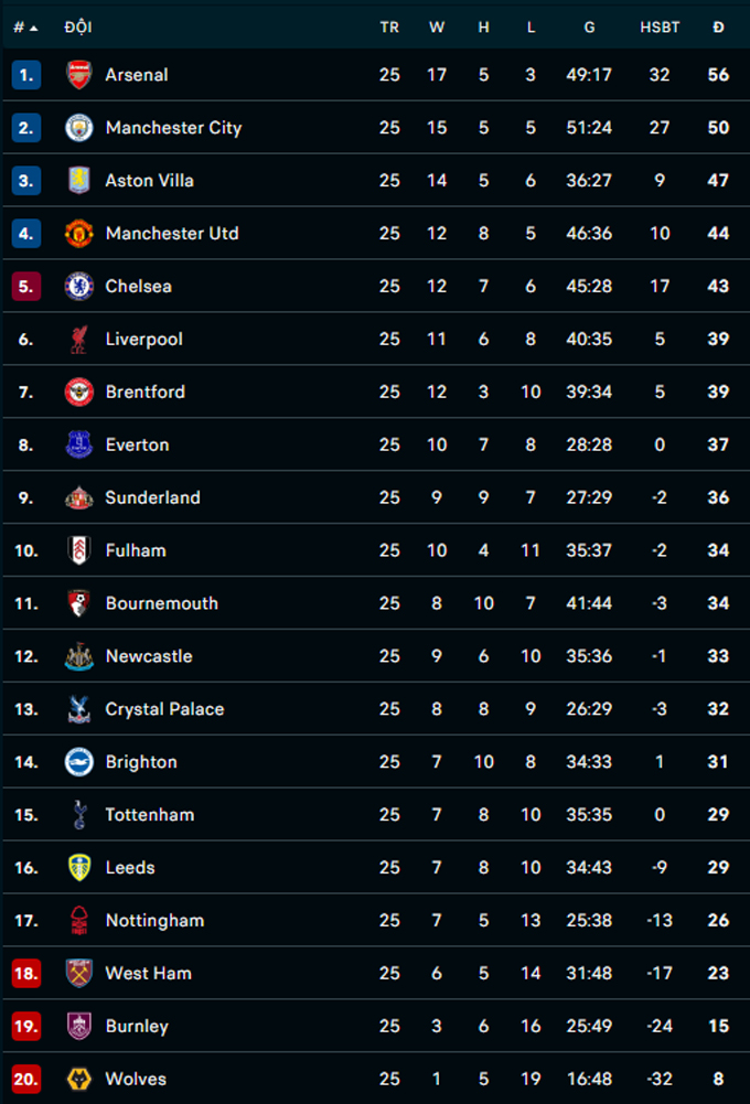 | Premier League - Vòng 25 | |||