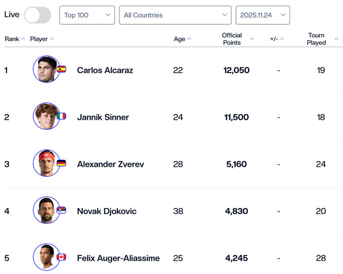 Trong khi đó, Novak Djokovic, người từng thống trị làng quần vợt hơn một thập kỷ, hiện tụt xuống hạng 4 ATP với 4.830 điểm. Đây là hệ quả của việc Djokovic không thi đấu nhiều trong thời gian qua và liên tục bỏ lỡ các giải lớn.