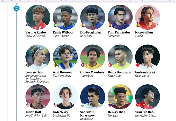 Ngày 14/10, The Guardian của Anh đã đưa ra danh sách 60 cầu thủ trẻ triển vọng nhất thế giới trong năm 2025. Đáng chú ý trong danh sách này có tên của cầu thủ trẻ Trần Gia Bảo đến từ HAGL.Theo The Guardian, Trần Gia Bảo được bình chọn vào danh sách này là bởi “Trở thành cầu thủ trẻ nhất ra sân và ghi bàn tại V-League khi mới 16 tuổi. Thậm chí trước đó, chàng tiền đạo đa năng này (có thể đá tiền đạo trung tâm hoặc lùi sâu) đã gây ấn tượng mạnh mẽ và chinh phục người hâm mộ bằng vẻ ngoài điển trai”.
