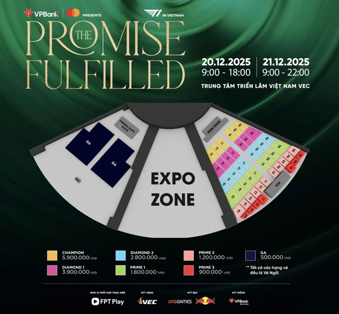 Sự kiện “VPBank presents T1 in Vietnam: The Promise Fulfilled” sẽ diễn ra ngày 21/12 tại VEC, Hà Nội. Vé được mở bán độc quyền từ 12h ngày 8/12 trên nền tảng CTicket, với 7 hạng vé dao động từ 500.000 đồng đến 5,9 triệu đồng. Người mua vé phải thanh toán bằng thẻ VPBank Mastercard.