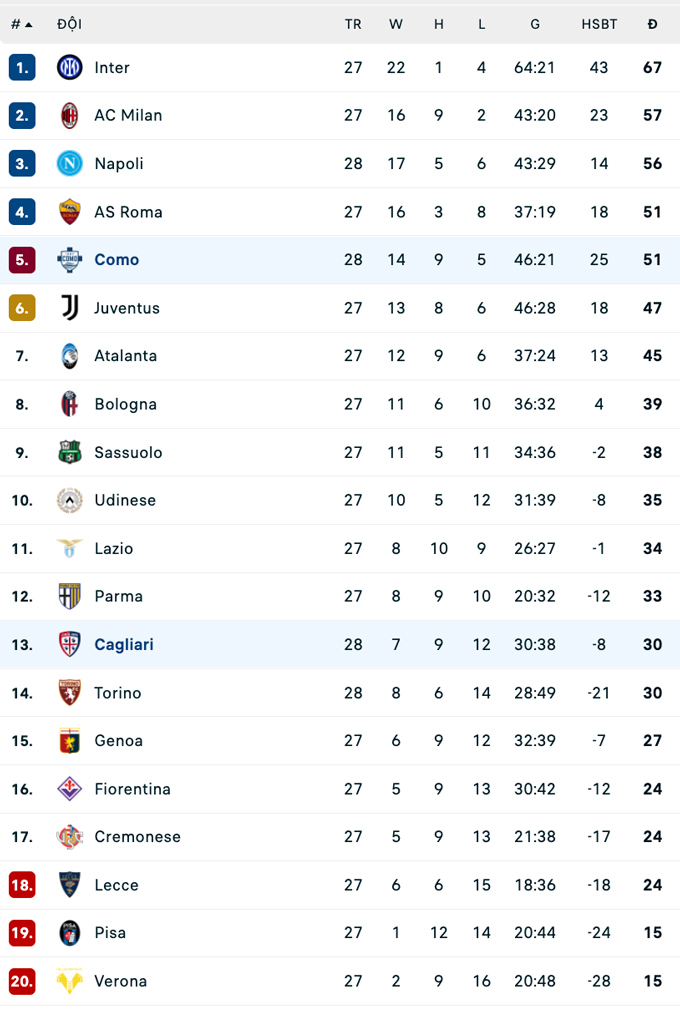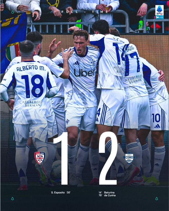 Chung cuộc, Cagliari thất bại 1-2 ngay trên sân nhà Unipol Domus. Dù thi đấu đầy nỗ lực và tinh thần chiến đấu đáng khen, họ vẫn không thể giành điểm và tiếp tục đối mặt với nguy cơ lớn trong cuộc đua trụ hạng. Trong khi đó, Como đã cân bằng về điểm số với đội xếp thứ 4 là AS Roma nhưng đá nhiều hơn 1 trận.
