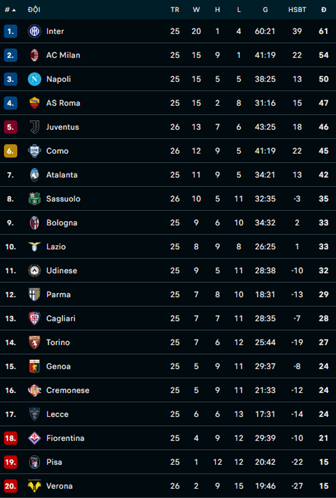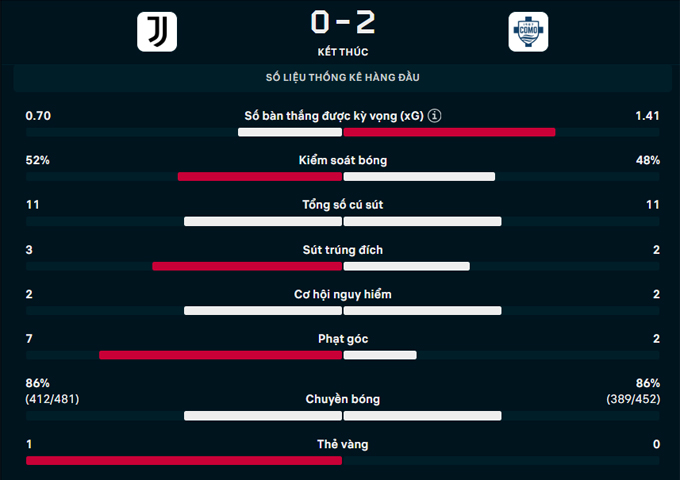Chung cuộc, Juventus thua 0-2 trước Como. Lúc này, Como đang xếp thứ 6 trên BXH Serie A 2025/26 khi có 46 điểm. Họ kém đúng 1 điểm so với đội phía trên là Juventus. Ngoài ra, Como chỉ còn kém CLB đứng thứ 4 là Roma 2 điểm nhưng chơi nhiều hơn đối thủ 1 trận.