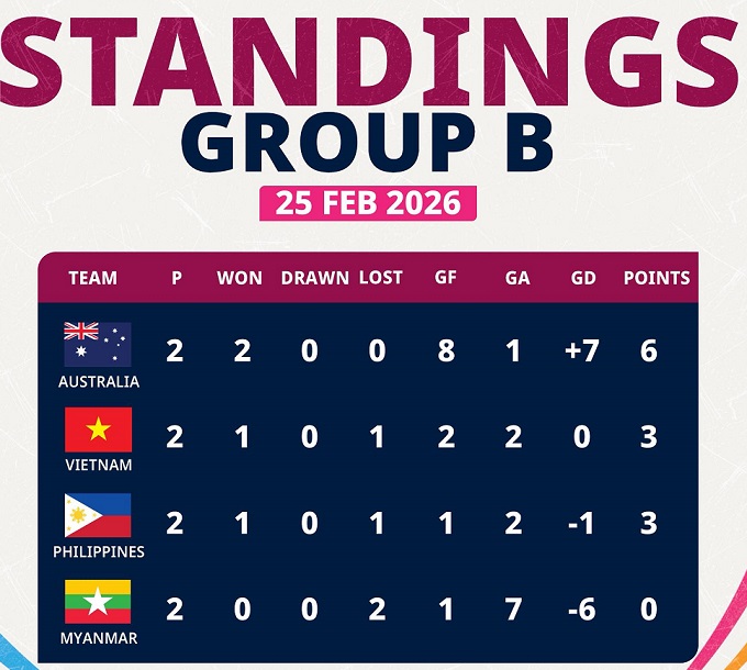 -Philippines thắng với cách biệt 1 bàn: Hiệu số đối đầu của Australia là 2/1, Việt Nam là 2/2, Philippines là 1/2.