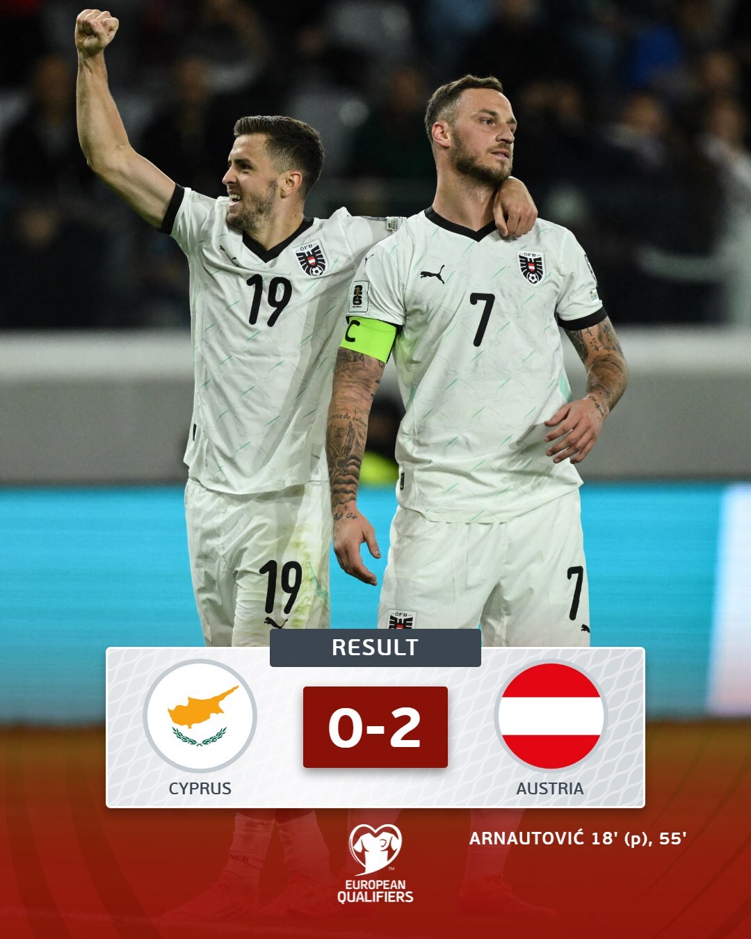 Chung cuộc, nhờ cú đúp bàn thắng của Arnautovic, Áo đánh bại Đảo Síp 2-0 để đứng vững ngôi đầu bảng H, thắng 6 và để thua duy nhất 1 trận. Họ đang hơn đội nhì bảng Bosnia (2 điểm) và nắm quyền tự quyết trong tay.