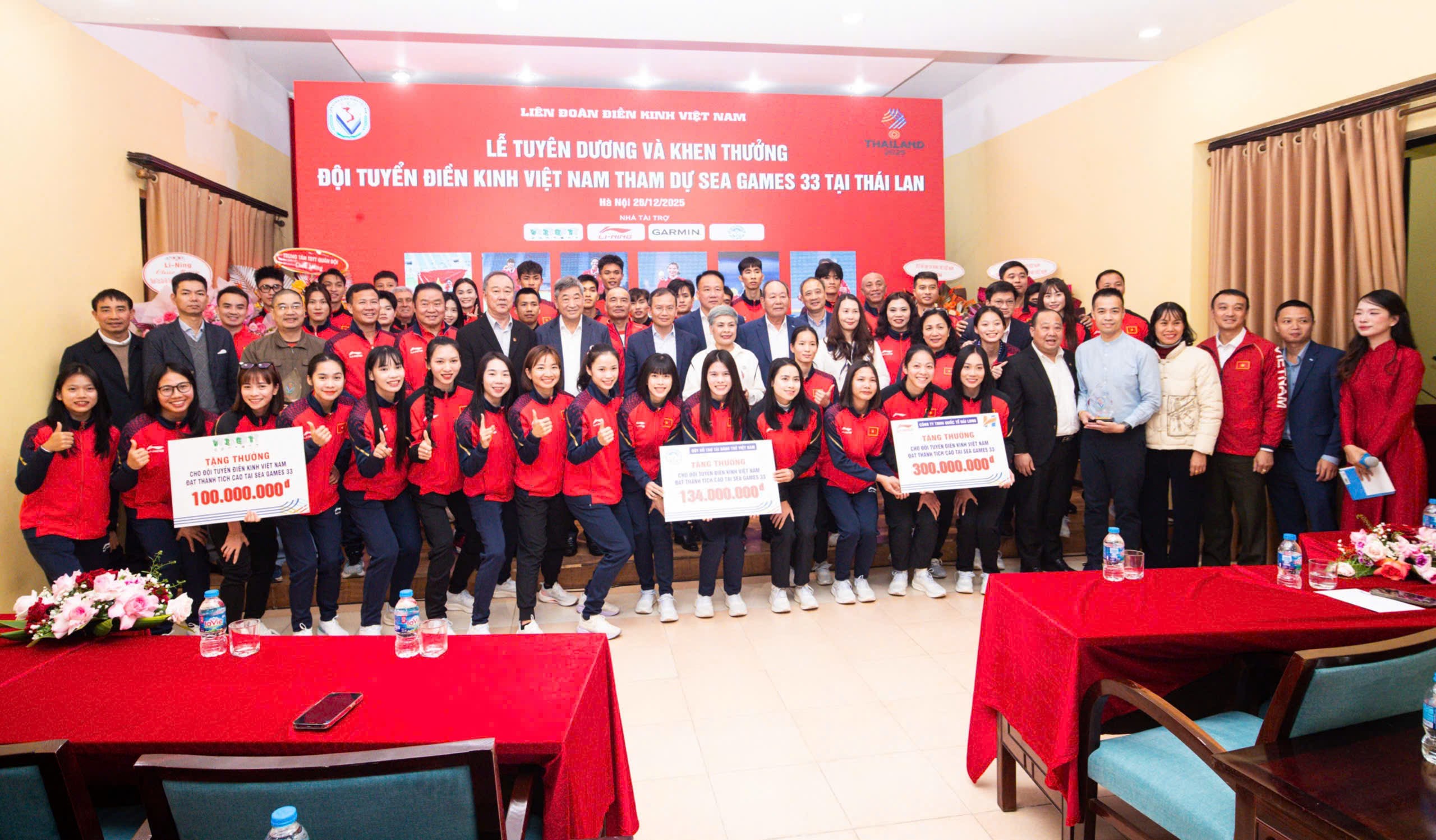 Nhằm kịp thời động viên, khen thưởng cho tập thể Đội tuyển Điền kinh hoàn thành xuất sắc chỉ tiêu đề ra, như đã công bố trước ngày đội lên đường tham dự SEA Games, Liên đoàn Điền kinh Việt Nam phối hợp với các nhà T trợ tổ chức Lễ khen thưởng với tổng số tiền 1 tỷ đồng cho đội tuyển điền kinh Việt Nam tham dự SEA Games 33.