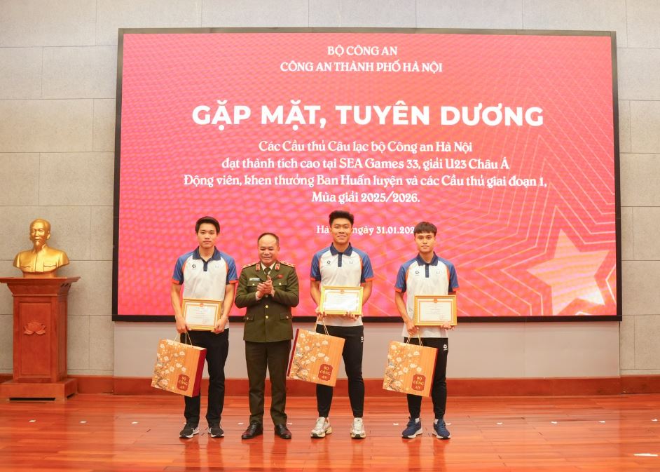 Sau bài phát biểu của Trung tướng Nguyễn Thanh Tùng, 3 cầu thủ Nguyễn Đình Bắc, Phạm Lý Đức và Phạm Minh Phúc vinh dự được nhận phần thưởng của Bộ trưởng Bộ Công an và giấy khen của Giám đốc Công an Thành phố Hà Nội vì những thành tích xuất sắc tại SEA Games 33 và VCK U23 châu Á 2026.