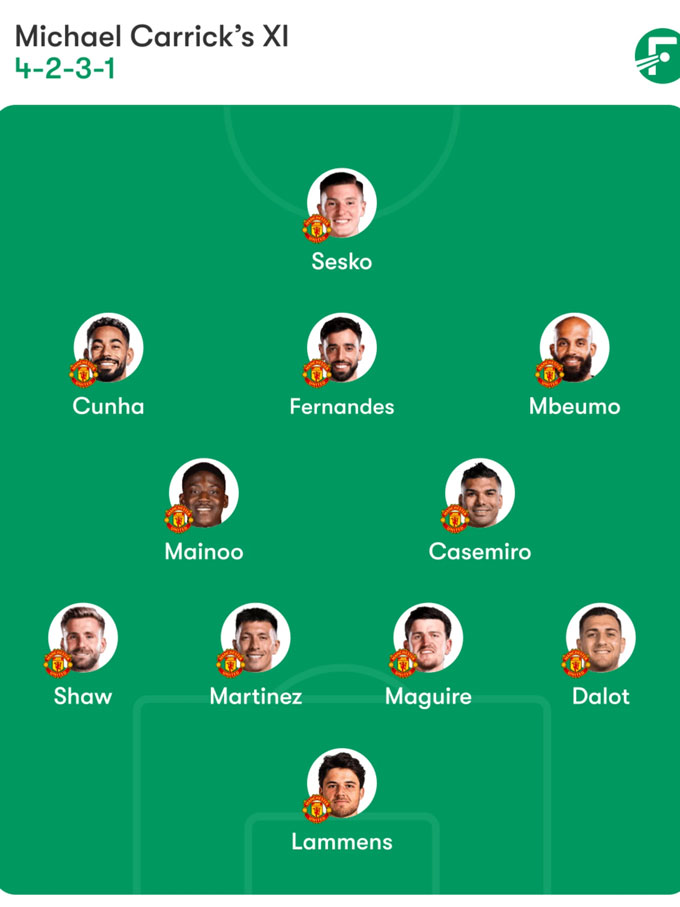 Đây là đội hình giúp Carrick duy trì sự ổn định ở tuyến giữa, đồng thời đặt niềm tin vào khả năng sáng tạo của Bruno Fernandes và sức mạnh tấn công của Sesko cùng Mbeumo.