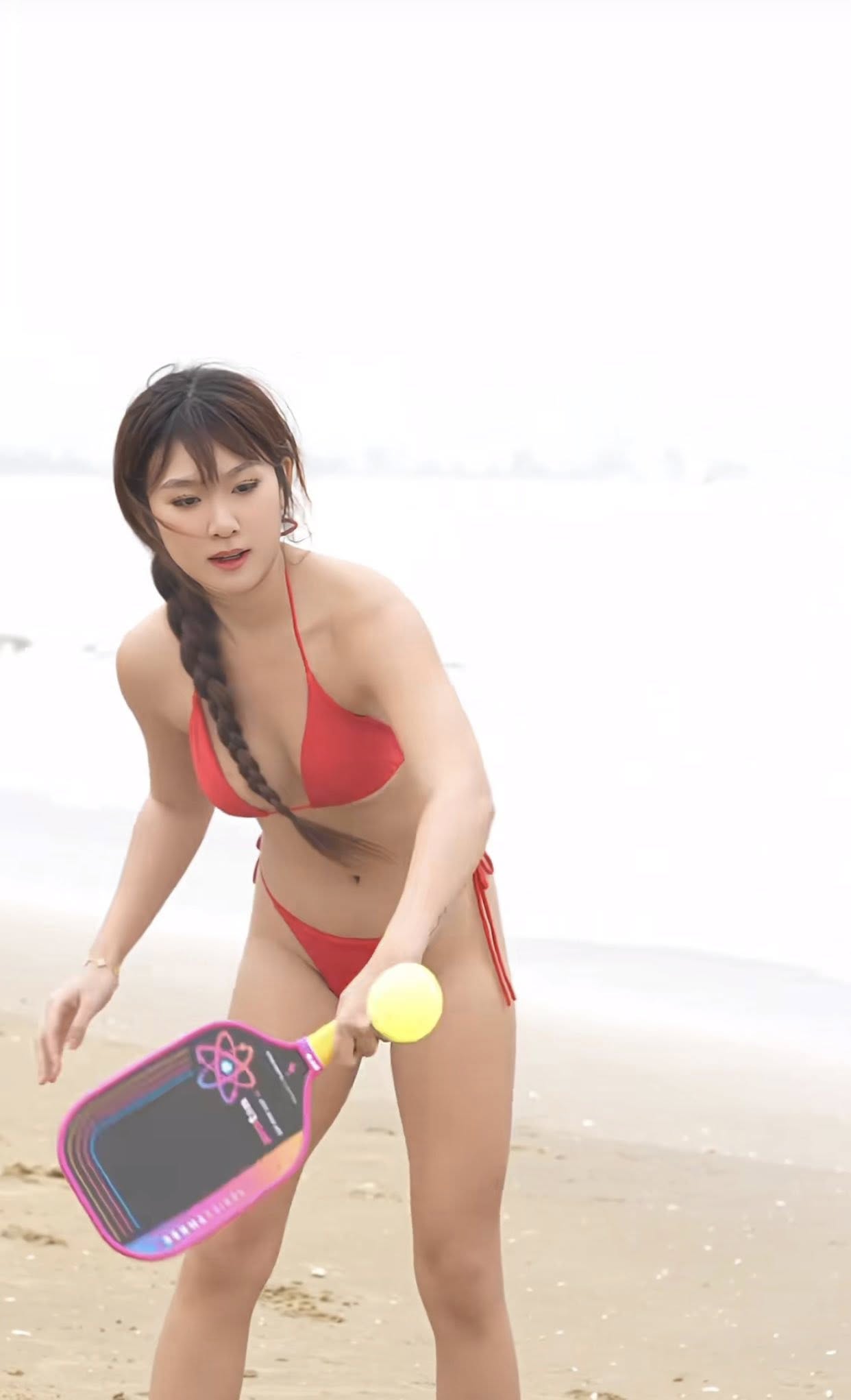 Đoạn clip được đăng tải trên TikTok và Facebook cho thấy cô nàng mặc bộ bikini hai mảnh táo bạo, tự tin cầm vợt và thể hiện các pha đánh pickleball ngay trên bờ cát, cạnh sóng biển xanh.