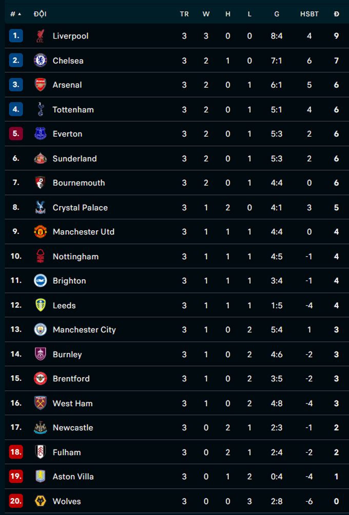 | TT | Đội bóng | Trận | +/- | Điểm |