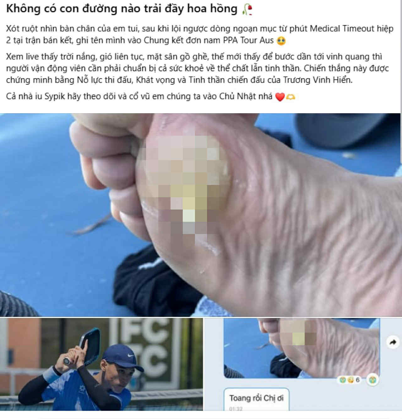 Hình ảnh bàn chân phồng rộp của vận động viên Trương Vinh Hiển sau trận bán kết đơn nam PPA Tour Australia 2025 đã khiến cộng đồng mạng không khỏi xót xa và nể phục.