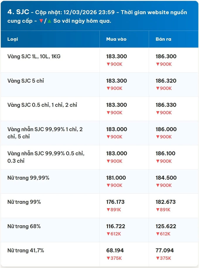 Tính đến lúc 4h00, giá vàng hôm nay 13/3/2026 đang được giới đầu tư theo dõi sau khi thị trường vừa khép lại phiên giao dịch chiều hôm qua với xu hướng điều chỉnh giảm. Dữ liệu cập nhật trước giờ mở cửa sáng nay cho thấy mặt bằng giá vàng miếng SJC tại nhiều doanh nghiệp lớn hiện đang xoay quanh vùng 183 – 186 triệu đồng/lượng, với giá bán ra phổ biến ở mức 186,3 triệu đồng/lượng.