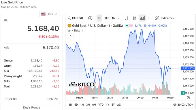 Giá vàng thế giới hôm nay 13/3/2026 tiếp tục giao động quanh mức 5.150 USD/ounce