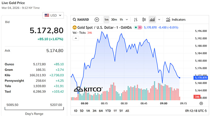 Tính đến 04h00 ngày 5/3/2026 (giờ Việt Nam), giá vàng thế giới giao ngay mức 5.172,8 USD/ounce. Ghi nhận tăng 85,1 USD/ounce so với ngày hôm qua. Quy đổi theo tỷ giá USD tại ngân hàng Vietcombank (26.304 VND/USD), vàng thế giới có giá khoảng 164,1 triệu đồng/lượng (chưa tính thuế, phí). So sánh với giá vàng miếng SJC trong nước cùng ngày (181,2-184,2 triệu đồng/lượng), giá vàng SJC hiện cao hơn giá vàng quốc tế khoảng 20,1 triệu.