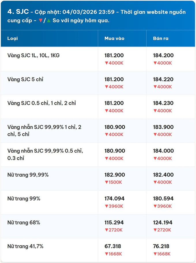 Trước giờ giao dịch ngày 05/3/2026, mặt bằng giá vàng SJC trong nước phổ biến quanh ngưỡng 181 – 184 triệu đồng/lượng, phản ánh rõ nhịp điều chỉnh mạnh đã diễn ra ở cuối phiên ngày 4/3.