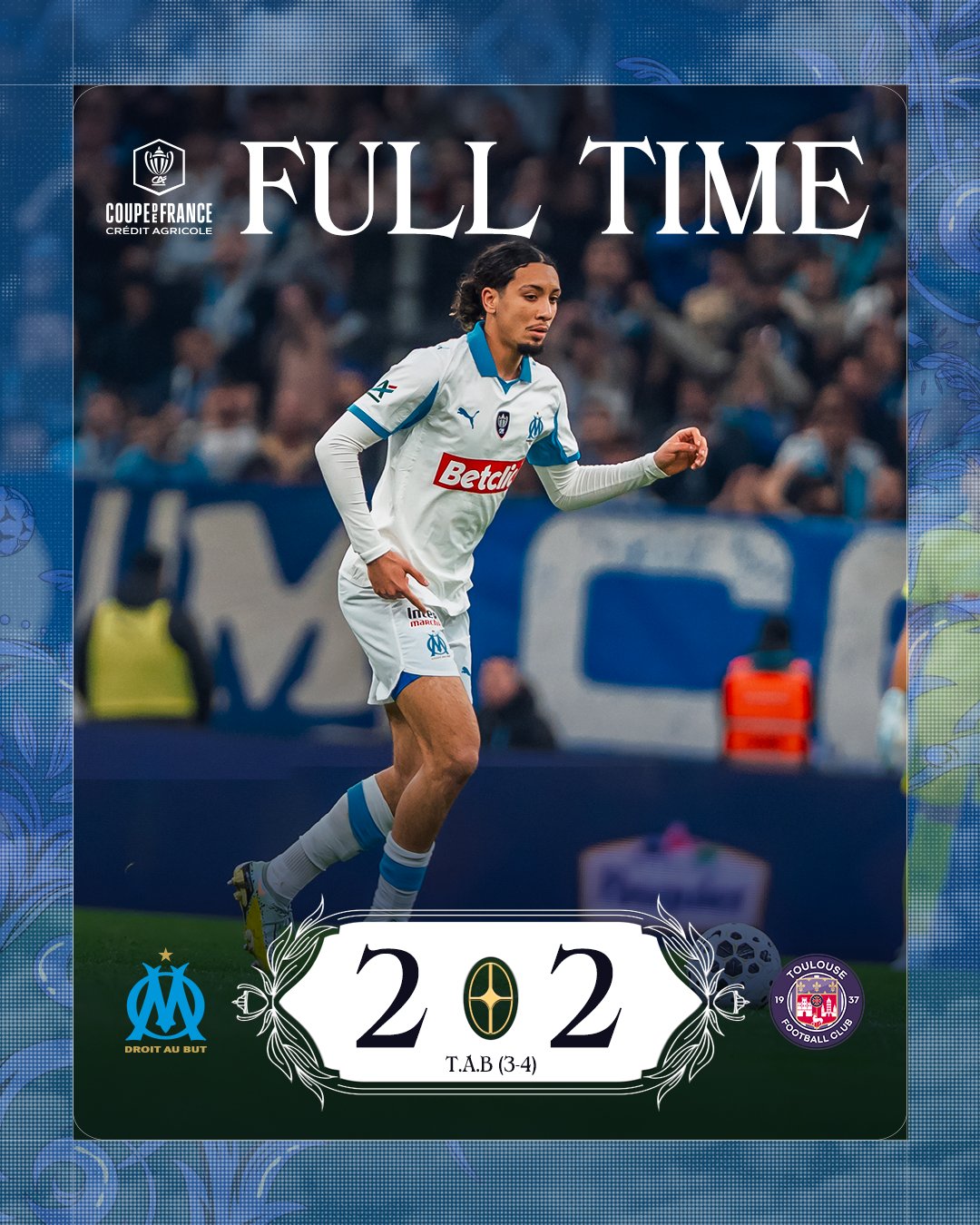 Bước vào loạt sút luân lưu, trong khi Toulouse chỉ có 1 trường hợp đá hỏng thì Marseille lại có 2, bao gồm cả Nwaneri - T năng trẻ của Arsenal được CLB miền Nam nước Pháp mượn. Thua 3-4 sau loạt cân não, Marseille chia tay cúp Quốc gia Pháp trong nghẹn ngào.