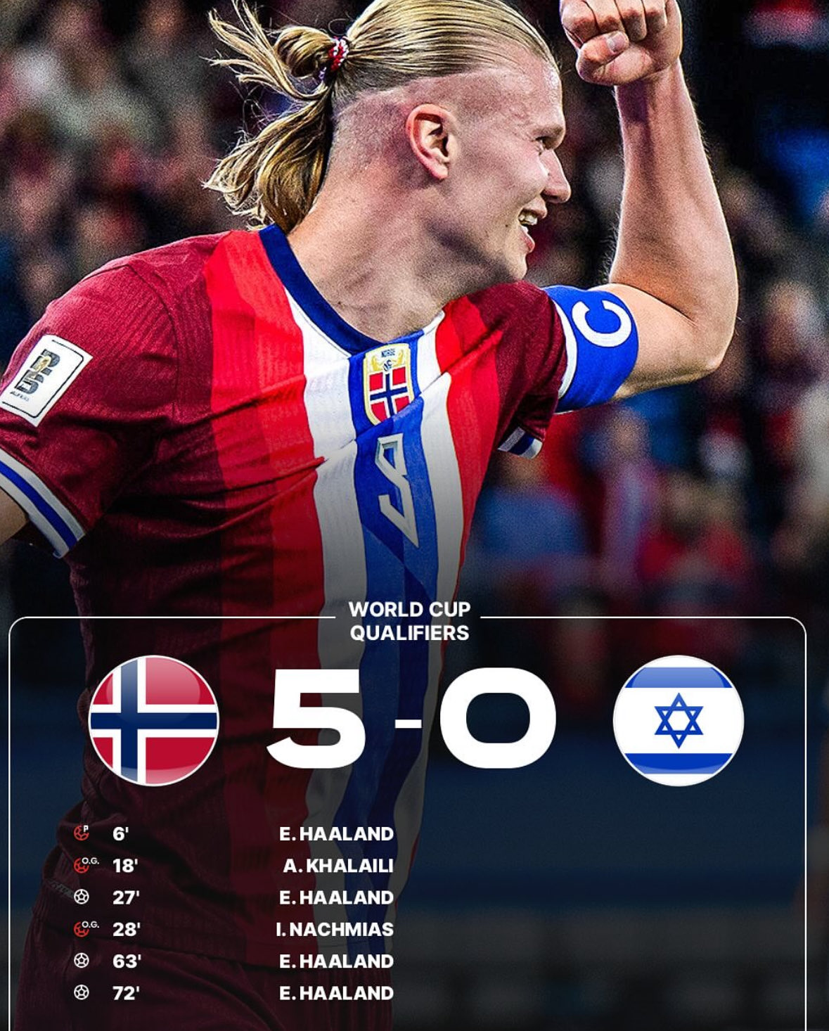 Trước đôi thủ chỉ là Israel, Na Uy với phong độ xuất sắc của Haaland với cú hat-trick ấn tượng đã dễ dàng đánh bại đối thủ với tỷ số 5-0. Như vậy, Haaland đã ghi 51 bàn chỉ sau 46 lần ra sân cho tuyển quốc gia.
