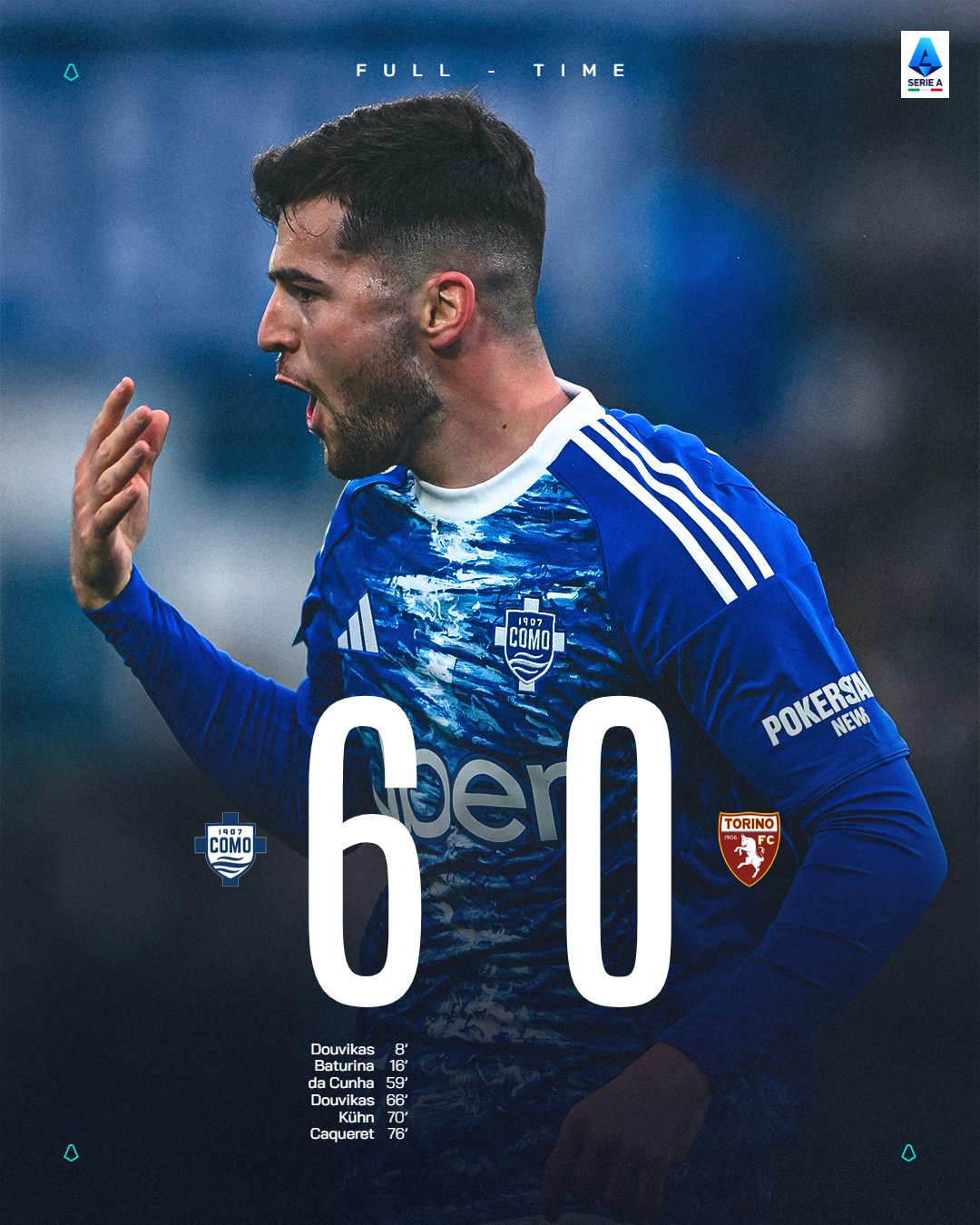 Sau khi từng đánh bại Torino 5-1 ở lượt đi mùa giải, đội bóng tý hon của Serie A tiếp tục gây sốc với chiến thắng áp đảo 6-0 ở lượt về. Như vậy, sau cả lượt đối đầu ở Serie A mùa này, Como có tới 11 lần sút tung lưới đối phương.