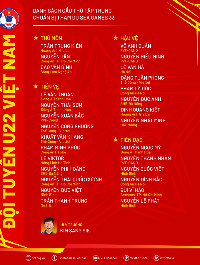Một loạt những gương mặt quen thuộc như Trung Kiên, Nguyễn Hiểu Minh, Nguyễn Nhật Minh, Phạm Lý Đức, Nguyễn Phi Hoàng, Võ Anh Quân, Khuất Văn Khang, Nguyễn Xuân Bắc, Nguyễn Thái Sơn, Viktor Lê, Nguyễn Thanh Nhàn, Nguyễn Quốc Việt, Lê Văn Thuận, Nguyễn Đình Bắc… tiếp tục góp mặt. Tuy nhiên, tổn thất lớn nhất đối với U22 Việt Nam ở chiến dịch SEA Games 33 là sự vắng mặt của tiền vệ Nguyễn Văn Trường. Cầu thủ của Hà Nội không may dính chấn thương đứt dây chằng ở giải tập huấn Panda Cup, qua đó lỡ hẹn với giải đấu trên đất Thái Lan sắp tới.