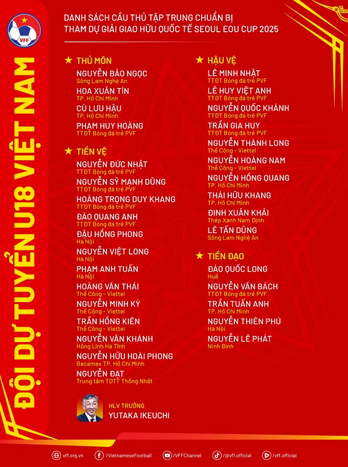 Ngày 25/8, đội dự tuyển U18 Việt Nam đã tập trung để tập luyện chuẩn bị cho giải đấu quốc tế Seoul Eou Cup 2025 tại Hàn Quốc. HLV người Nhật Bản, Yutaka Ikeuchi đã được bổ nhiệm dẫn dắt đội. Chuyên gia người Nhật Bản ký hợp đồng với LĐBĐ Việt Nam hồi tháng 2/2025 và đảm nhiệm vai trò cố vấn giám sát kỹ thuật của đội U17 Việt Nam tại VCK U17 châu Á 2025.