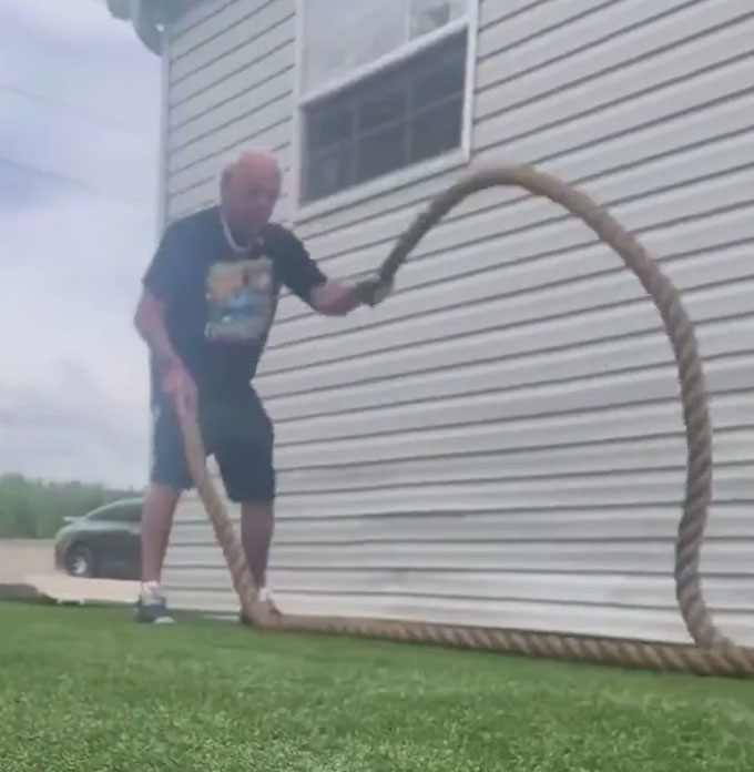 Trong đoạn video gửi tới 1,2 triệu người theo dõi trên X, ông liên tục thực hiện các bài tập nặng: chèo máy, đạp xe quạt, kéo xe trượt và đánh dây thừng. Mỗi động tác đều được Flair thực hiện với quyết tâm cao độ, như thể ông vẫn đang chuẩn bị cho một trận đấu lớn.