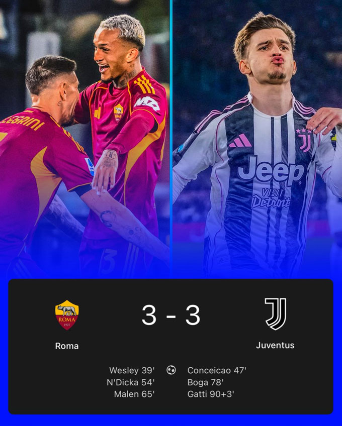 Tại vòng 27 Serie A, Juventus hành quân tới sân của Roma với nhiệm vụ phải thắng để giành vị trí trong top 4. Đoàn quân của HLV Gian Piero Gasperini nhập cuộc hứng khởi khi Niccolo Pisilli liên tục khuấy đảo hàng thủ đội khách, trước khi Wesley mở tỷ số bằng siêu phẩm cứa lòng ở phút 39.