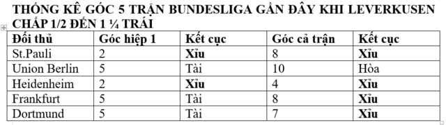 4 trận Bundesliga gần đây của Leverkusen đều không nổ T góc (3 X, 1 hòa). 5 trận sân nhà vừa qua của Leverkusen ở Bundesliga, kết cục về số góc chung cuộc là 3 X, 1 hòa, 1 T.