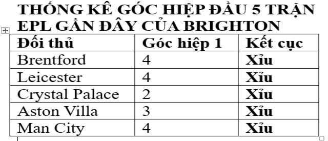 Cả 5 trận Premier League gần đây của Brighton đều về X góc hiệp 1. Brighton chấp West Ham 3/4 trái trong trận cầu lúc 21h00 tối nay. 8/9 trận Premier League gần nhất của West Ham với theo châu á từ 0 đến 1 ¼ trái về X phạt góc hiệp 1. Số góc trong 45 phút đầu cuộc chạm trán này sẽ thấp hơn mốc được niêm yết 4,5.