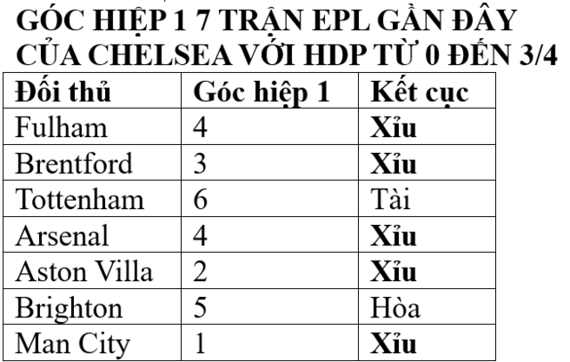 4 trận chính thức liên tiếp gần đây của The Blues chỉ có vỏn vẹn 11 góc trong 45 phút đầu tức bình quân 2,75 quả/hiệp, 100% X góc hiệp 1.
