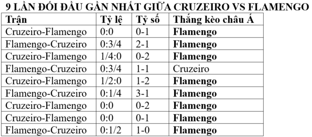 Đội khách Flamengo chấp nửa trái trong trận cầu lúc 04h30 sáng mai ở giải VĐQG Brazil. Cruzeiro thua theo châu á 4/5 trận chính thức gần đây khi không phải đội cửa trên. Trong khi đó, Flamengo thắng kèo 4/5 trận chính thức vừa qua trên sân khách khi chấp 1/4 đến 1/2 trái, đồng thời thắng kèo tới 8/9 lần chạm trán gần nhất giữa đôi bên. Dù Flamengo là đội bóng mạnh ở Brazil, việc chấp Cruzeiro tới nửa trái trên sân khách là rất sâu, Flamengo sẽ giành 3 điểm.