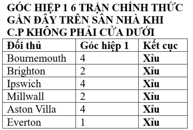Crystal Palace chấp 1/4 trái. Tuy Crystal Palace có tổng góc hiệp 1 trên sân nhà cao thứ ba toàn giải (5,29 quả/hiệp) nhưng số góc cao chủ yếu trong những trận họ chống lại đại địch. Cả 6 trận chính thức vừa qua trên sân nhà khi Crystal Palace không phải cửa dưới đều về X góc hiệp 1.