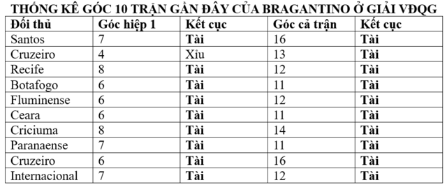 Cả 10 trận gần đây của Bragantino ở giải VĐQG Brazil đều nổ T phạt góc, đây là thống kê nói lên thói quen đá góc rất ổn định của đội bóng này. 4 trận vừa qua của Mirassol ở giải VĐQG, 3 trận xuất hiện tối thiểu 9 góc. Tỷ lệ tổng góc trận cầu lúc 05h00 sáng mai ở giải VĐQG Brazil được niêm yết là 10,5. Cẩn thận thì nên đợi nó hạ xuống 9,5 hoặc 9 rồi bắt đầu cổ vũ nhiều góc.