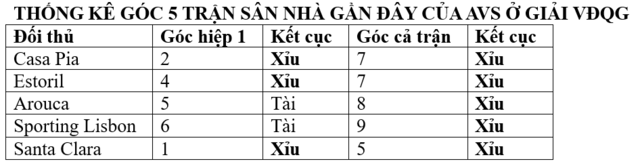 Trong 18 đội dự giải VĐQG Bồ Đào Nha mùa này, AVS xếp thứ 17 về tổng phạt góc trên sân nhà, bình quân chẵn 8 quả/hiệp. Vì thế không ngạc nhiên khi cả 5 trận sân nhà gần đây của AVS ở giải VĐQG đều về X phạt góc.