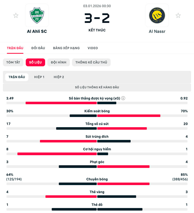 Kết quả Al Ahli 3-2 Al Nassr: Thất bại đầu tiên