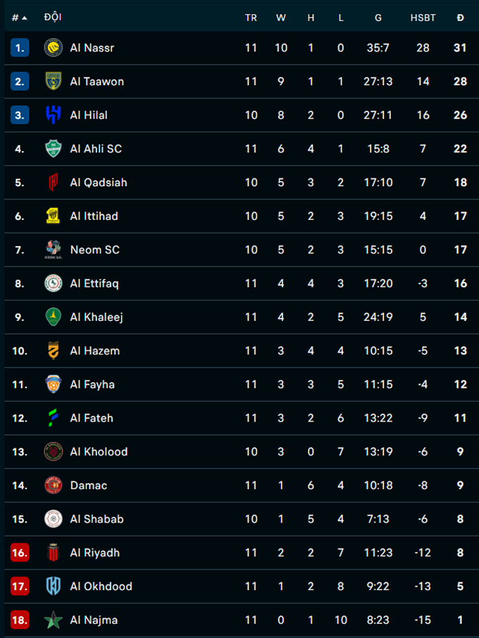 Hiện Al Nassr có 31 điểm, hơn Al Taawon 3 điểm. Dù vậy, Al Nassr cũng có thể hài lòng khi họ kết thúc năm 2025 với vị trí đầu bảng.