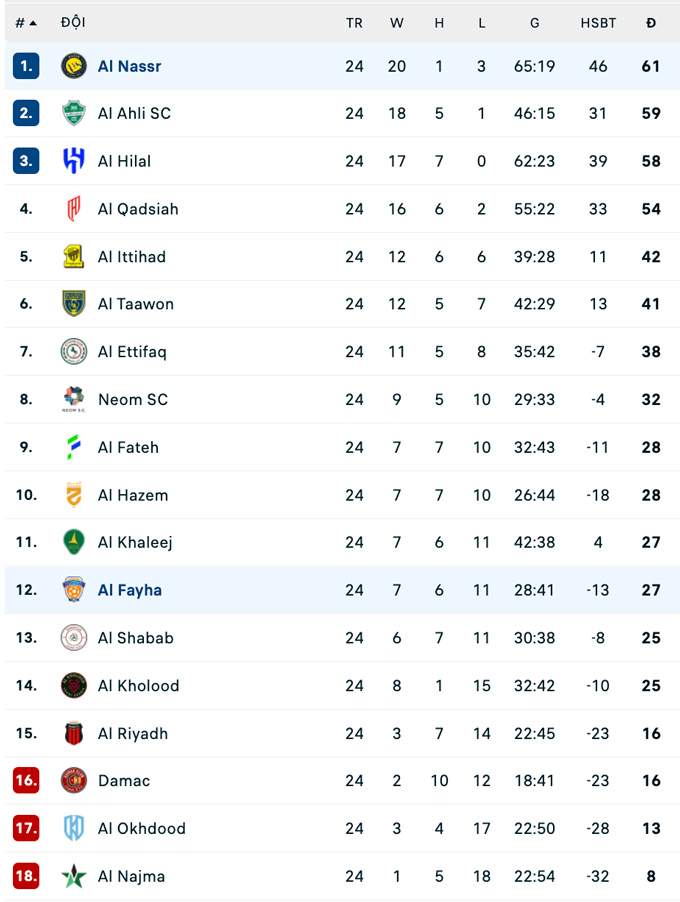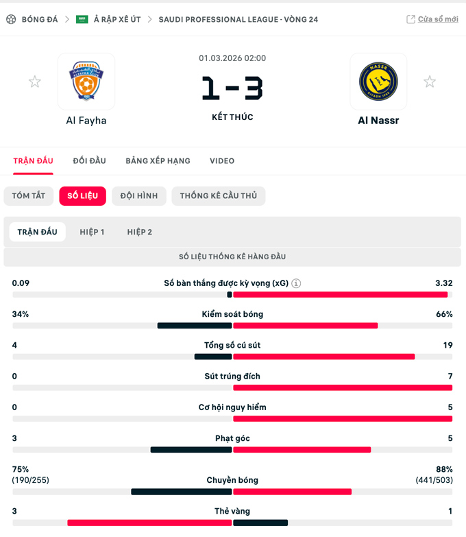 Chiến thắng này giúp Al Nassr vươn lên dẫn đầu bảng xếp hạng Saudi Pro League với 61 điểm, xếp trên Al Ahli (59 điểm) và Al Hilal (58 điểm).