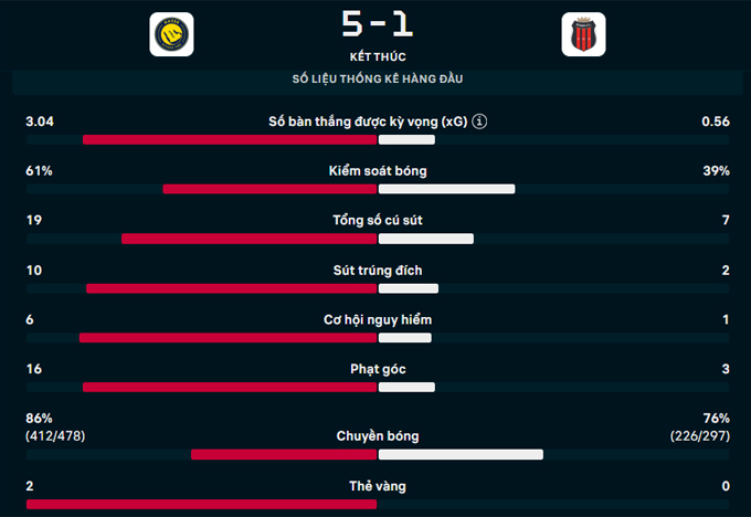 Phút 76, Ronaldo dứt điểm đầy uy lực, ấn định chiến thắng 5-1 cho Al Nassr. Bàn thắng này là pha lập công thứ 29 trong năm dương lịch của Ronaldo. Với 9 điểm hiện có, Al Nassr chiễm trệ ở ngôi vị số 1 trên BXH giải VĐQG Saudi Arabia 2025/26.