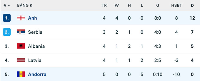 ĐT Anh vẫn đang đứng đầu bảng K với 4 trận toàn thắng, ghi được 8 bàn và chưa để thủng lưới bàn nào. Trong khi đó, Andorra đứng bét bảng với 5 trận toàn thua, chưa ghi được bàn nào và thủng lưới tới 10 lần.
