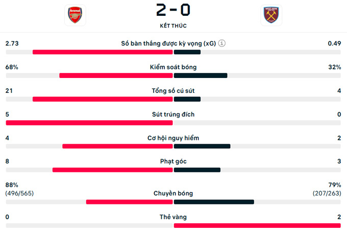 Ở quãng thời gian còn lại, West Ham thi đấu đầy nỗ lực song Arsenal với hàng thủ vững chãi đã không cho đội khách bất kỳ cơ hội nào để phản kháng. Chung cuộc, Arsenal đánh bại West Ham 2-0 trên sân nhà Emirates ở vòng 7 Ngoại hạng Anh.