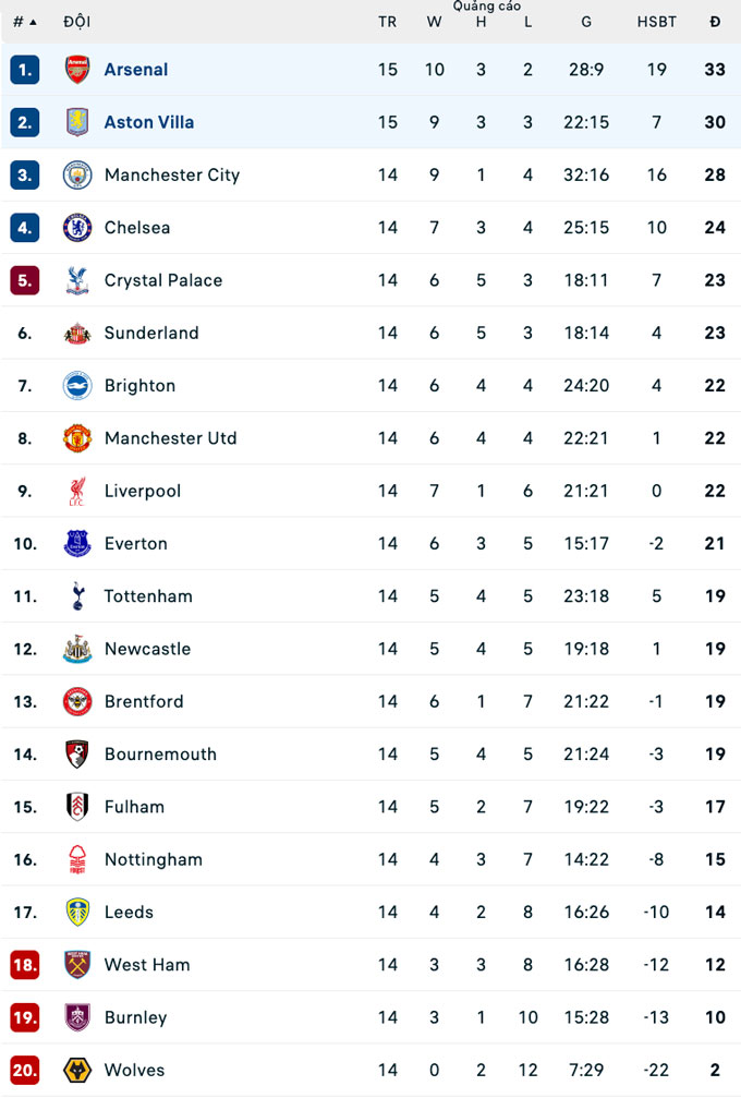 | TT | Đội bóng | Trận | +/- | Điểm |